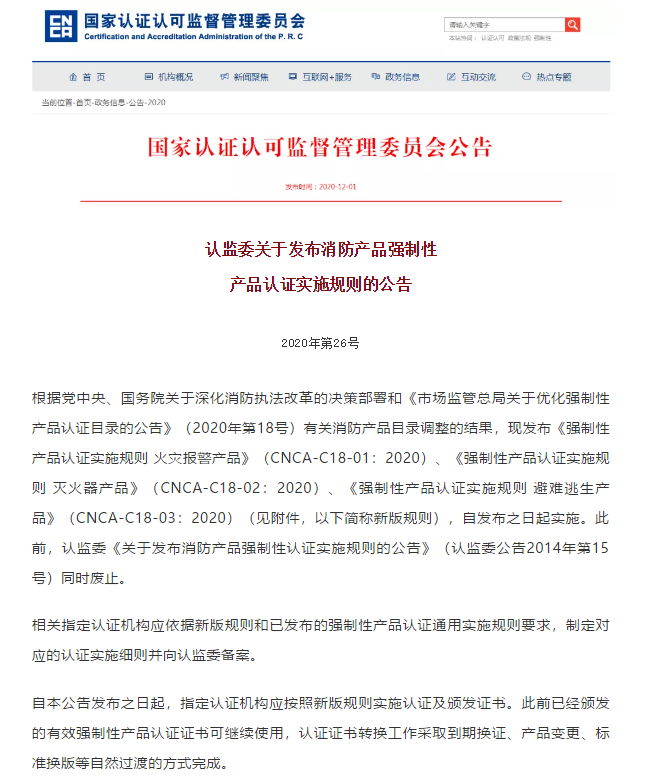 12月1日,认监委发布消防产品强制性产品认证实施规则,规则自发布之日起实施。