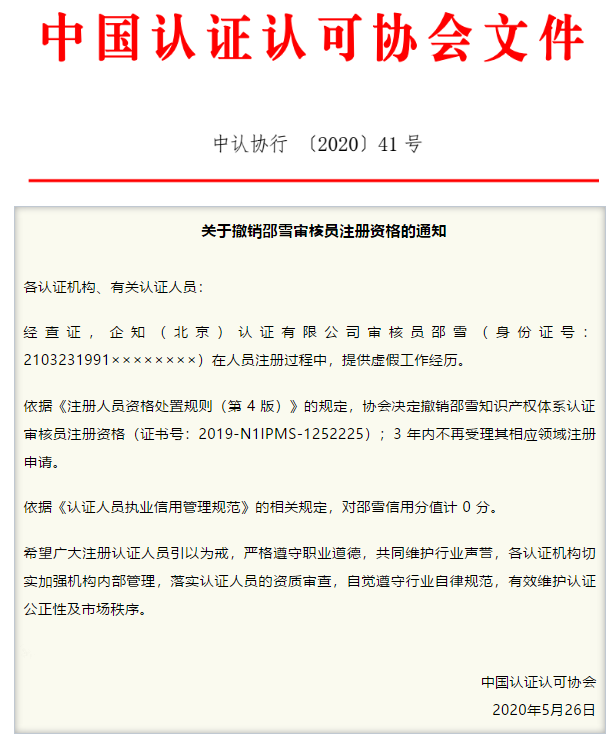 近日,中国认证认可协会发布通知,决定撤销邵雪知识产权体系认证审核员注册资格。